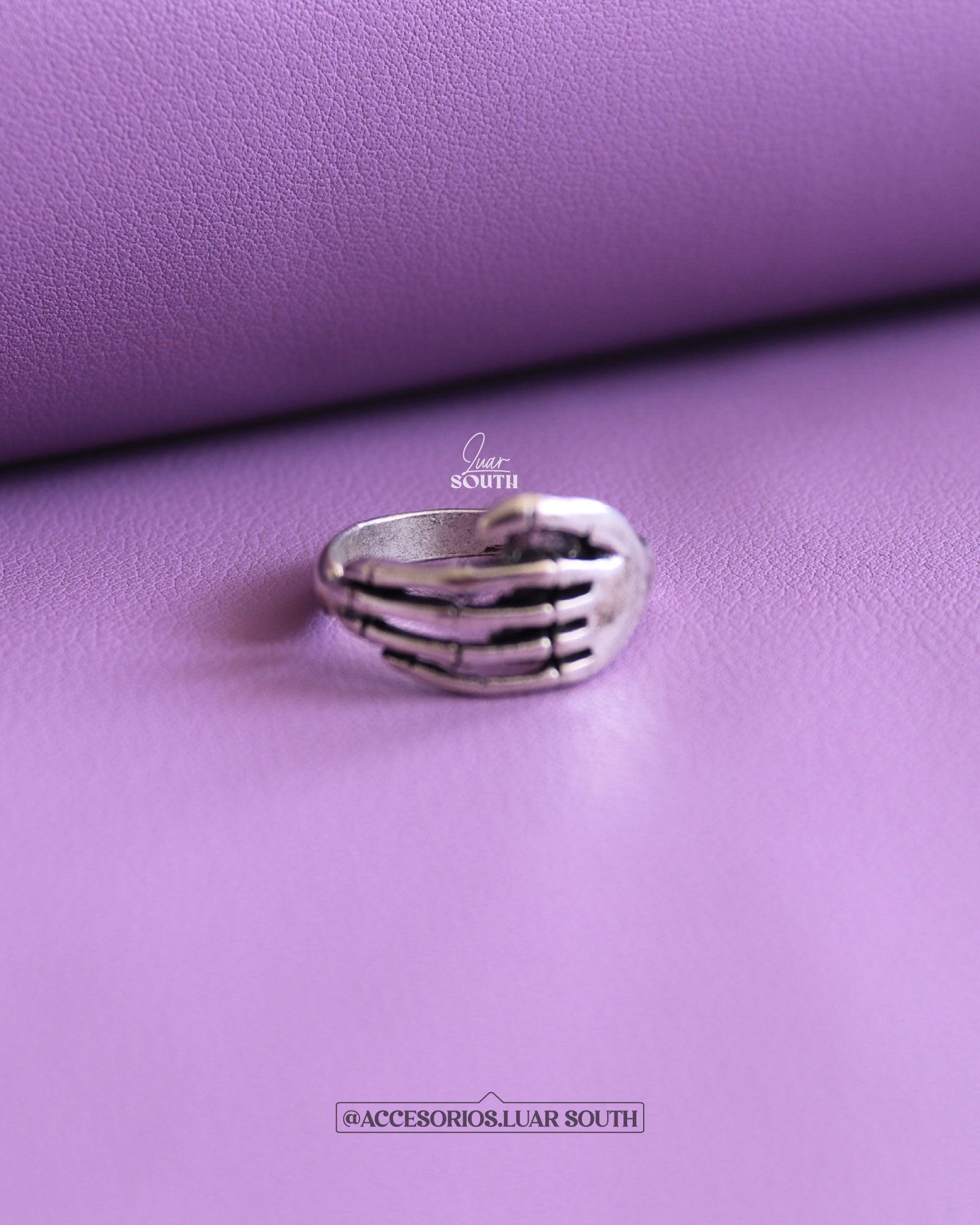 Anillo graduable de mano calavera. Su material es aleación en tono plateado