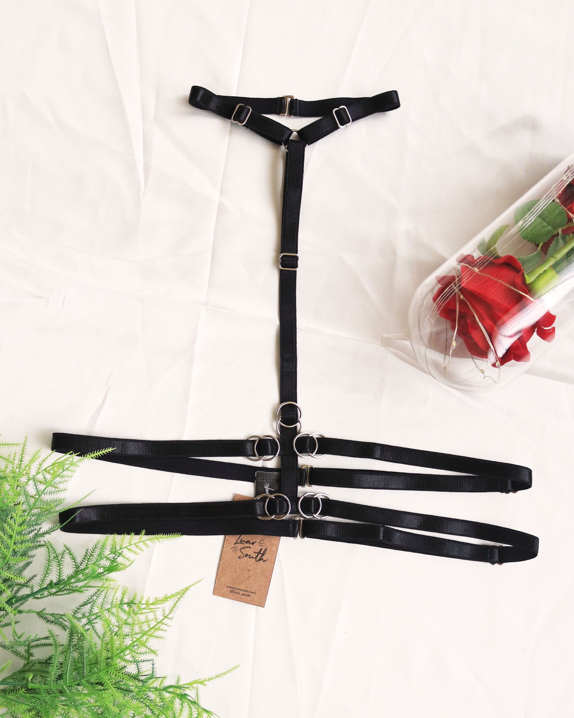 • Lindo arnés de torso doble con detalles metálicos.