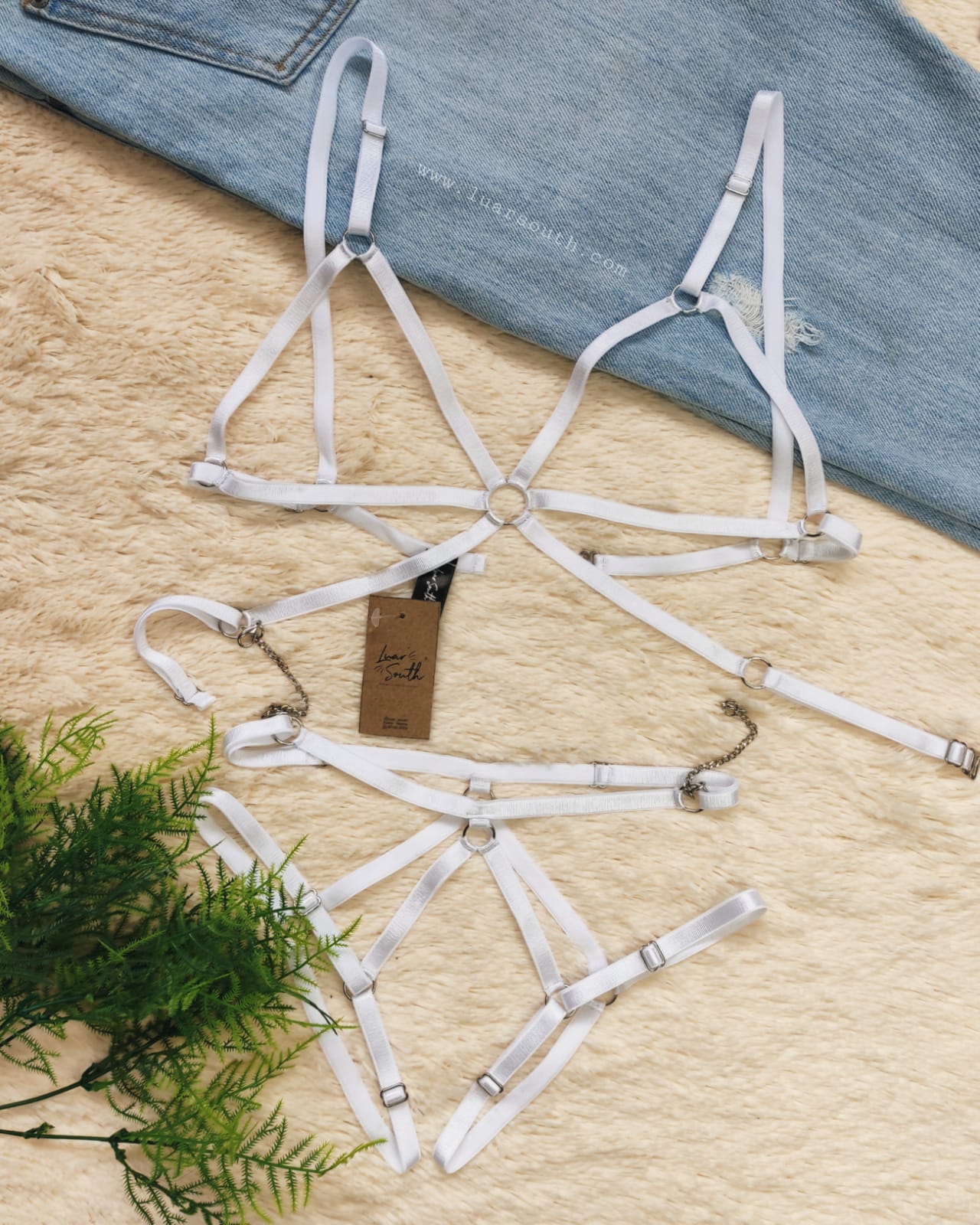Buscas un Set que se complemente muy bien con tu vestuario o lencería. Este set te va a encantar, fabricado en cintas semi elásticas con detalle de cadena para unir el bra con el panty arnés.