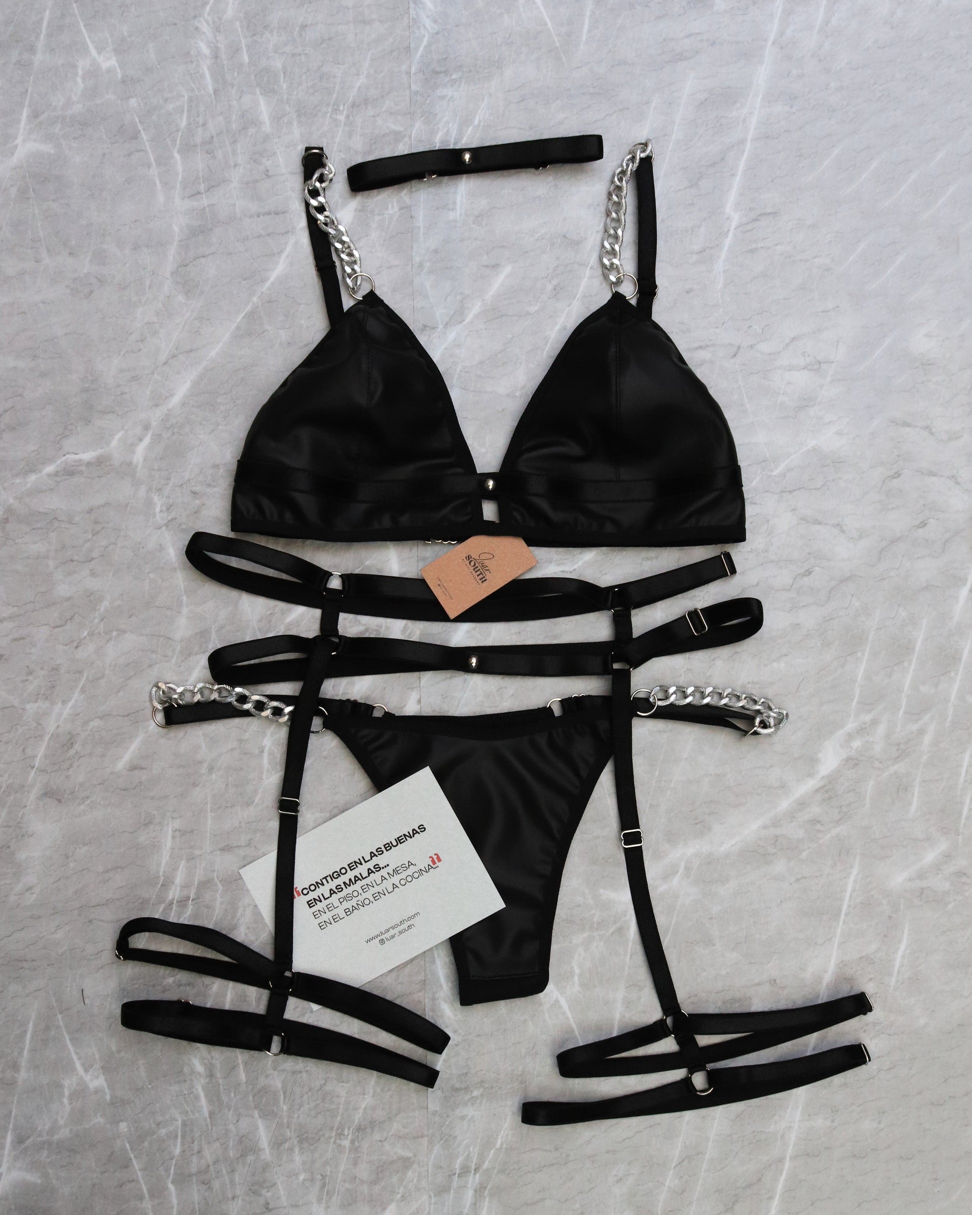 • Set 4 piezas fabricado en cuerina y detalles de cadena